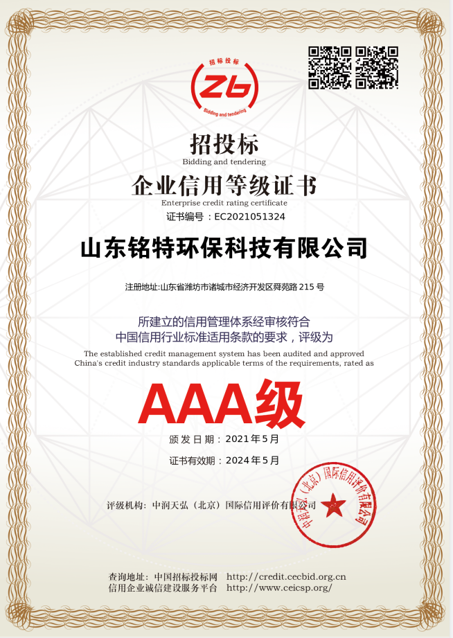 山東銘特環保科技有限公司是主營污水處理設備的生產廠家,公司成立于2012年,通過引進美國技術成立的一家集技術研發、產品生產、設計施工于一體的生產型企業。公司坐落山東諸城,東臨海濱名城青島市,南毗新興港口日照,區位優越,交通便捷,基礎設備齊全。公司注冊資金1200萬元,擁有固定資產1000余萬元,現有員工80余人,其中大專以上學歷或具有中級以上職稱的專業技術人員10余人。 我公司常年與山東輕工學院及國內多家院所合作,擁有較強的非標設計、制造和服務能力,公司具有環保工程設計及環保設備生產資質,可為用戶提供技術咨詢、工藝設計、場區平面布置、設備安裝和調試等一條龍服務。